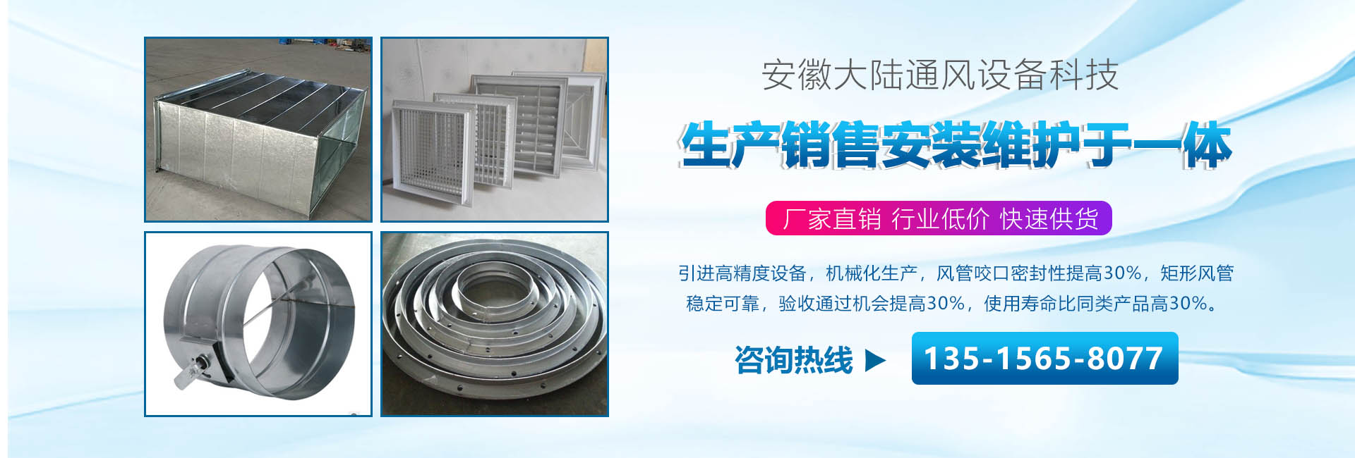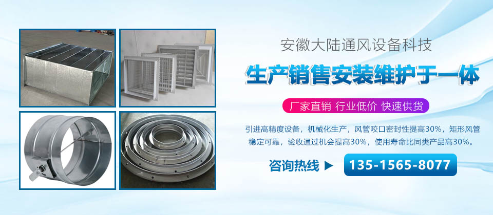 安徽大陸通風設備科技有限責任公司加工共板法蘭風管、螺旋風管、角鐵法蘭風管、插接式風管。價格合理。質量保障。是國內生產和研究通風管道的企業,工廠坐落于經濟發達的安徽省合肥市。公司配備了好的自動化流水線設備和先進的制作安裝技術。